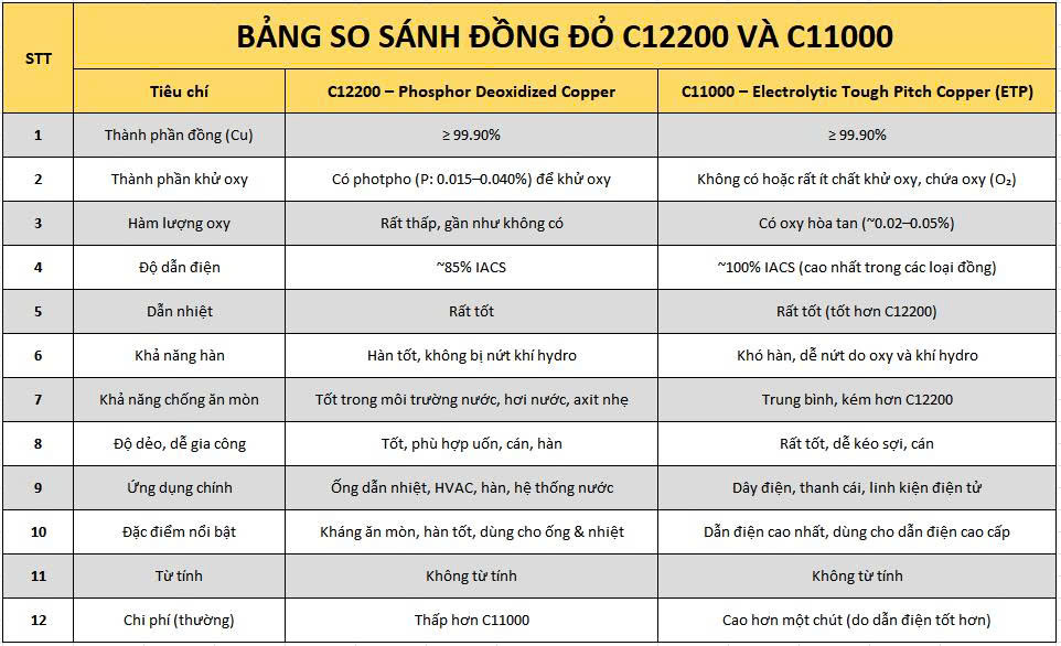 So sánh đồng đỏ tấm C12200 và đồng C11000